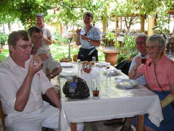 We select hotels which are close to a range of inexpensive restaurants and eating places where we can sample a range of traditional local meals - as a rule western cuisine is often also available. Where possible we stop during the day for a light lunch or snack in a local café. If a site is not close to a café, a picnic lunch might be organised in advance (tour participants buy some food the night before and share). Turkey does not have good coffee as a general rule (Nescafe instant is usual! And it is expensive) - 'Turkish Coffee' is definitely preferable. We always bring a coffee plunger to make the morning coffee for the group.