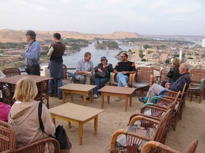 The following day we went by bus to Aswan, stopping along the way to see the Temples of Edfu and Kom Ombo. This entailed an early start but we all enjoyed the sight seeing and had late lunch in Aswan over looking the Nile while watching the feluccas sail by. In Aswan we stayed at the Marhaba Hotel at the northern end of the city - it has a beautiful view across the river to the tombs of the Nobles, and a pleasant roof terrace. The sunsets were particularly spectacular perhaps aided by the consumption of a number of lime vodkas and G&T's.