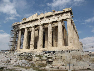 The following day we explored some of the antiquities of Athens. In the morning we went to see the remains of the monumental Temple of Zeus which the Roman Emperor Hadrian built below the acropolis. We also explored the remains of the sanctuaries nearby. Rom here we made our way to the acropolis, stopping to see the Theatre of Dionysus and the Asclepius Shrine. After lunch we climbed up to the summit of the acropolis to see the superb temples. Much reconstruction work has been done recently and the Parthenon and Erechtheion are both looking superb. The view across the city is stunning, and one can see the new Acropolis Museum which contains a stunning collection of sculpture from the area. We then explored the Areopagus Hill, and the Pnyx.