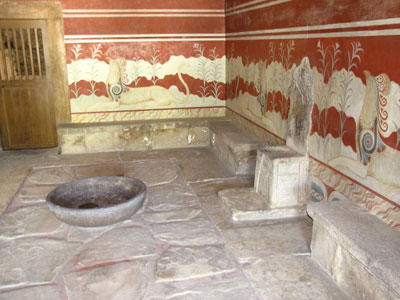 With some sadness we left the Peloponnesus and drove back to Athens through Arcadia and Achaea - most of the route seemed to be along a goat track with a precipitous valley on one side but the scenery was superb. We checked into the Athens airport hotel for our early morning flight to Iraklion on the Aegean island of Crete. This is a pleasant seaside town with a well preserved castle defending the harbour. The local museum was under restoration but they had a temporary exhibition of the most important finds which was very impressive. From Iraklion we visited the ruins of Knossos, the most important of the Minoan palace sites. Expensively 'restored' by Arthur Evans in the late 19th Century, the place remains are extensive and need time to fully understand. Much more conservation work has been done since my last visit which makes the remains come alive.