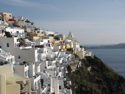 On our last day on Crete we enjoyed a scenic drive into the interior of the island. We headed into the mountains, stopping to look at a Minoan villa. We went up to the high country and visited the Idaean Cave, traditional the birthplace of the god Zeus. The mouth of the cave was hidden in snow and we made our way gingerly into the depths which were dark, mossy and suitably mysterious. En route we stopped to look at a few traditional stone houses used by shepherds in the winter months. We had a wonderful Easter lamb lunch with excellent red wine before heading down to the coast at Rethymnon through some magnificent rural countryside. Here we toured the Venetian castle before making our way back to Iraklion. The following morning we caught our ferry to the island of Santorini. The trip, about 80 km, took about 2 hours. The island is a flooded volcano and one approaches the main ferry stop as the towering cliffs rise above you. We stayed in the small town of Thera which has some good restaurants and a number of hotels with superb views over the caldera. The town in perched on the rim of the volcano with an almost vertical drop into the sea. We explored the numerous lanes of shops and then went for a walk along the edge of the volcano rim to a marvellous rock outcropping with magnificent views of the entire caldera.