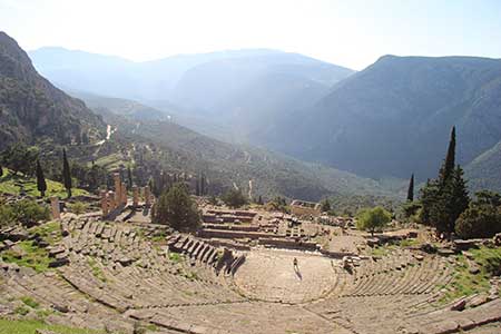 The following day was set aside for our exploration of ancient Delphi – we walked up through the ancient sanctuary exploring the remains of numerous 'treasuries' to the Temple of Apollo, god of light and music. We then continued further up to see the magnificent theatre and stadium. We also visited the gymnasium and the beautiful Sanctuary of Athena. In the afternoon our guide took us to visit the nearby Moni Osios Loukas Monastery with its beautiful frescos – the vista from the courtyard was absolutely stunning. Natasha and Anne looked particularly fetching in their wraparound garments.