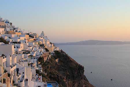 On the 6th October we caught a ferry to the island of Santorini. The 80 km trip took only 2 hours. The island is a flooded volcano and one approaches the main ferry stop as the towering cliffs of the caldera rise above you. We checked into our hotel (the Kavalari Hotel in Fira), and had some lunch at a restaurant overlooking the volcano - the rest of the day was free to the town of Fira. Many of the group went for a walk along the edge of the volcano rim while others explored the numerous shops in the town. We met up for dinner – a magnificent sunset over the volcano caldera!