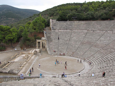 On the 5th of September we visited the Nauplion Museum which has recently been revamped and is well laid out and labelled - artefacts include suits of Mycenaean armour and numerous grave goods from the area including boar-tusk helmets. In the afternoon we had some free time. Some members of the group went to see the antiquities in Argos, while some of us climbed to the summit of the Venetian castle with its superb views over the Gulf of Argolis. The following morning we headed to the site of Epidauros, home of a major cult to the healing god Asclepius. A highlight of the visit was the magnificent theatre, one of the best preserved from the ancient world. Much of the sanctuary of Asklepius is being restored including the tholos temple and sleeping quarters. We also saw a Mycenaean bridge. After lunch we visited the ruins of Tiryns, with its splendid Mycenaean city walls and palace. Most impressive are the corbelled storage rooms and the well defended gates.