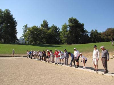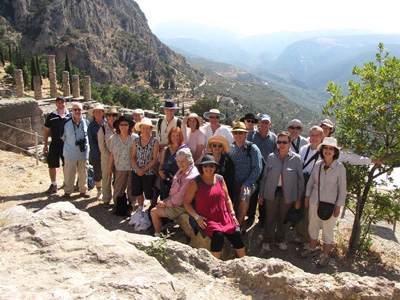 From Nauplion we drove across the Peloponnesus to the site of Olympia. Our road took us through some spectacular mountainous territory. We checked into the Hotel Europa and after lunch at a restaurant in town we explored the excellent site museum of Olympia which contains a superb display of the restored pedimental sculpture from the temples as well as numerous artefacts and statues from the sanctuaries. In the afternoon we enjoyed a swim in the hotel pool. The next day we explored the archaeological remains of Olympia, a large site with many well preserved buildings. Most impressive are the tholos temple and the Doric Temples of Hera and Zeus. The Olympic running track also gives the visitor a good impression of the ancient games - we recreated the start of the race but kept our clothes on! In the afternoon we drove to Delphi, crossing the impressive new suspension bridge over the Gulf of Corinth. The route is very scenic. We checked into the Arion Hotel and had dinner in a restaurant with views looking down over a wide valley leading to the sea.