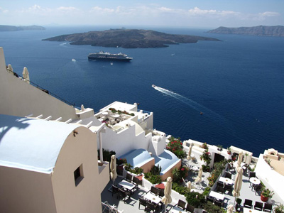 The next day we headed into the interior of Crete, passing through some very scenic country on our way to the archaeological sites of Phastos and Aghia Triadha. The first site is a major Minaon palace with a spectacular view of the snow capped mountains in the distance; the private rooms of the palace are particularly well preserved. Aghia Triadha is a small Minoan palace near the coast with many well preserved rooms. In the late afternoon we headed to the ferry wharf in Iraklion for our evening ferry to Santorini. The 80 km trip took about 3 hours. Santorini is a flooded volcano and one approaches the main ferry stop as the towering cliffs rise above you. We checked into the Panorama Suites which offered spectacular views - our rooms were cut into the pumice and had vaulted ceilings!