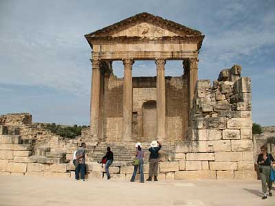 The following morning we left Tunis by bus and passed through the green Medjerja River Valley. In the late morning we arrived at the magnificent ancient Roman site of Dougga - here we explored the near intact ruins of the town. Highlights included the Capitol (Temple of Jupiter), the Roman theatre, the bath complex and numerous houses with mosaic floors. In the afternoon we checked into our hotel in El Kef, a picturesque hill town with panoramic views of the local countryside. The following day we visited the Sufi school with its ethnographic collection of Berber artefacts and explored the Ottoman fortress. We then had a memorable lunch which included a bowl of delicious molokiya soup with chunks of lamb (the resemblance to a swamp was purely accidental!). In the afternoon we made our way south to Sbeitla, location of the ancient Roman city of Sufetula.