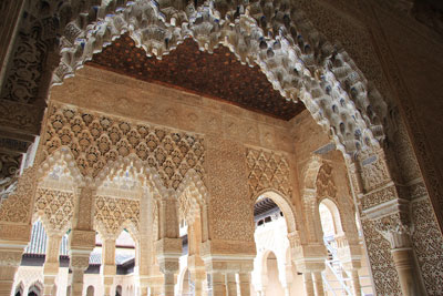 Other remarkable areas of the Alhambra we explored included the Palace of Charles V, a large 16th Century structure with impressive circular court, which is used to display a collection of Muslim artefacts and the gardens of the Generalife, the summer palace of the Sultans. The walled terraces have pools and fountains, and there are a number of airy pavilions which look down over the valley. The plaster work and wooden ceilings are truly beautiful.