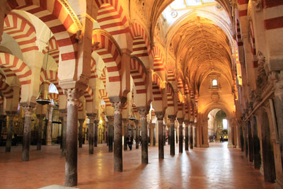 Cordoba is most famous for its fabulous 9th and 10th Century mosque (la Mezquita) with its vast forest of 1300 marble columns and spectacular mithrab, or prayer niche. There is a sense of infinity, as you look down the arcades of red and white arches, which is most impressive. Almost insignificant, and taking up a fraction of the ground plan, is the 16th Century Gothic cathedral which was imposed in the centre of the mosque during the reign of Charles V. The belfry of the church was originally the minaret of the mosque.