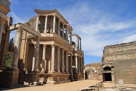 The following day, the 10th May, we explored the historic quarter of Toledo which preserves many monuments from the 10th Century onwards. A highlight was the stunning Gothic Cathedral from the 13th Century and the Mudejar Church of San Roman which houses an interesting collection of Visigothic material. We also saw two synagogues and the beautiful Isabelline Monastery of St John (Margaret Gaydon had fond memories of the place as the 15th Century chapel was where her son had married). Our trip then took us SW of Toledo through rich countryside. We made an unscheduled stop at Trujillo to see the mediaeval quarter of the town where the conquistador Francisco Pizarro was born. This terrible man, who conquered the Incas in Peru, is commemorated by an equestrian statue in the main square. We then headed to Merida and checked into our hotel (a converted monastery). Merida is a well preserved ancient Roman settlement. We walked through the arches of the stunning aqueduct and down to the bridge across the Guadiana River. The theatre and amphitheatre form a spectacular complex on the edge of the ancient city, and not far away we saw the well preserved hippodrome. The Museum of Roman Antiquities is excellent and has a wide range of artefacts and mosaics. Our road then took us south to the Roman site of Italica - it has a wonderful amphitheatre and the houses preserve numerous mosaics in situ.